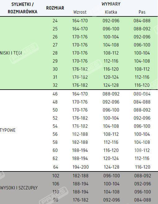 | Rozmiar | 24, 25, 26, 27, 28, 29, 30, 31, 32, 46, 48, 50, 52, 54, 56, 58, 60, 62, 64, 102, 106, 110, 98 |