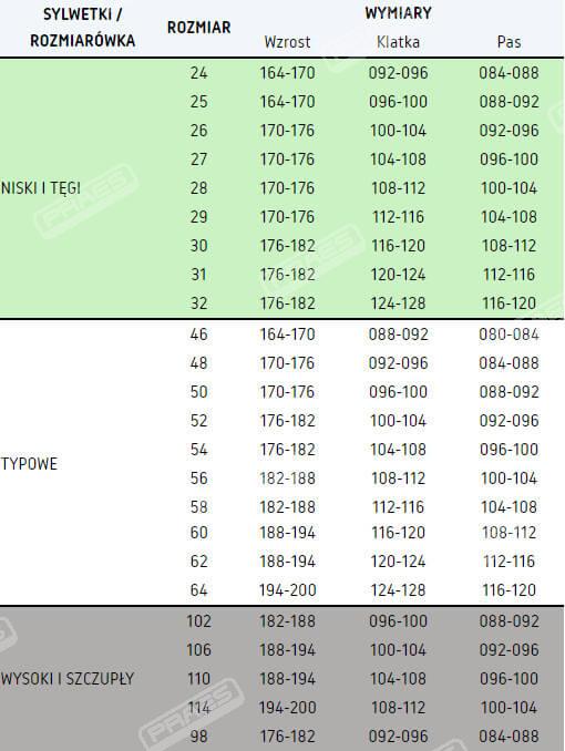 | Rozmiar | 24, 25, 26, 27, 28, 29, 30, 31, 32, 46, 48, 50, 52, 54, 56, 58, 60, 62, 64, 102, 106, 110, 114, 98 |