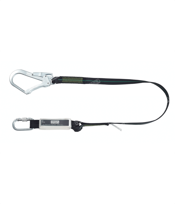 Lina z amortyzatorem 1,5m, taśma pojedyncza, stalowy karabinek zakręcany, stalowy hak do rusztowania