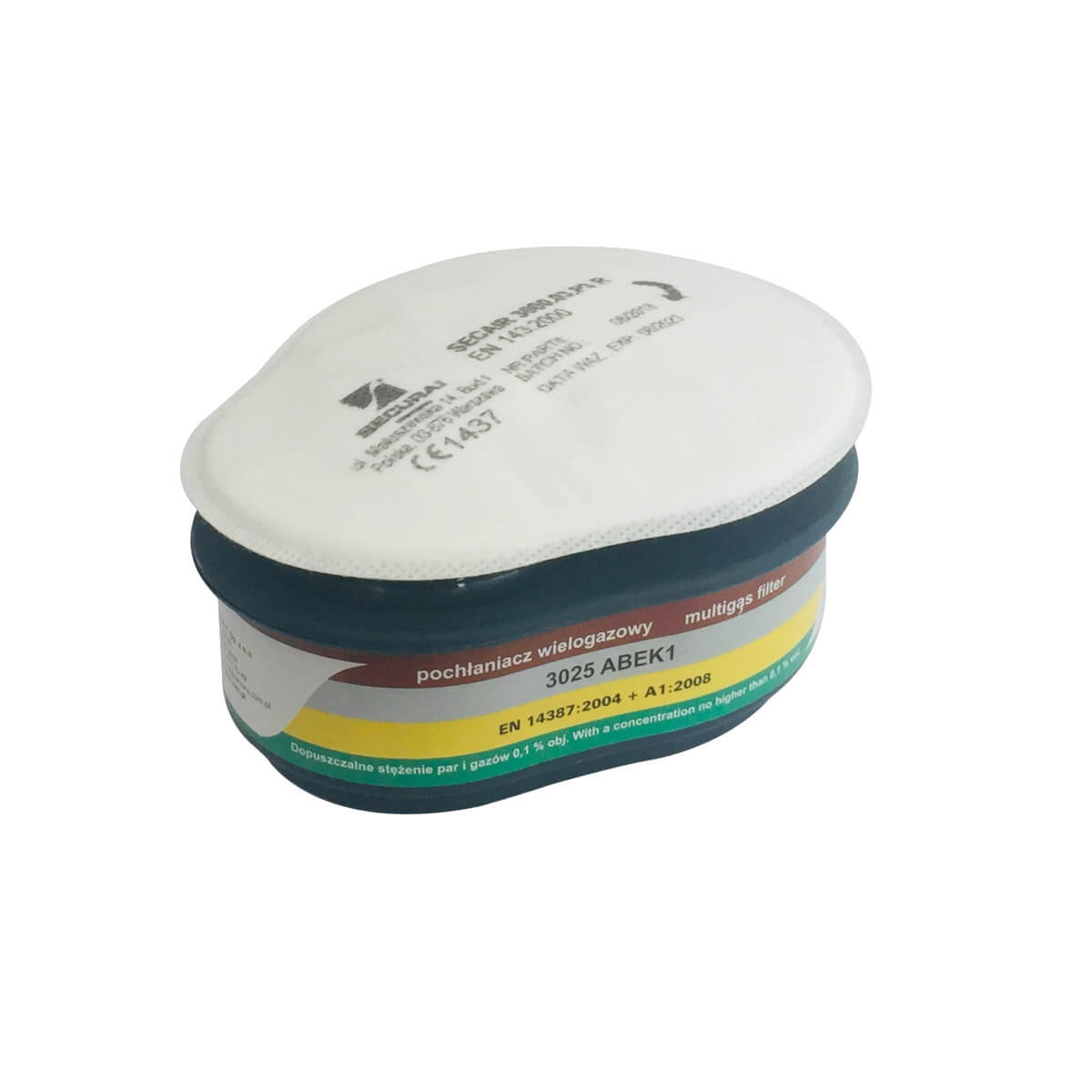 Zestaw filtrów 3055 ABEK1 P3 R (pochłaniacz 3025 ABEK1 + filtr SECAIR 3000.03 P3 R), po skompletowaniu z maską, półmaską lub półmaską z kapturem, chroni układ oddechowy przed gazami organicznymi i nieorganicznymi, parami i gazami substancji organicznych, amoniakiem i jego pochodnymi organicznymi.